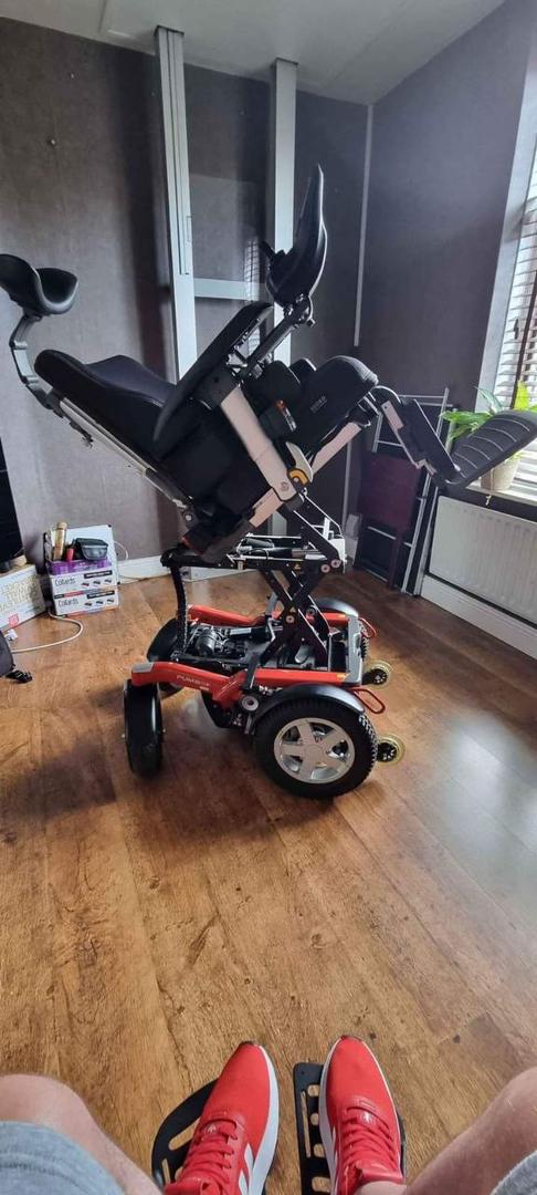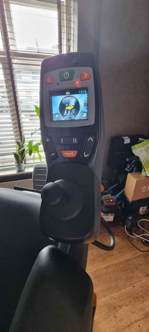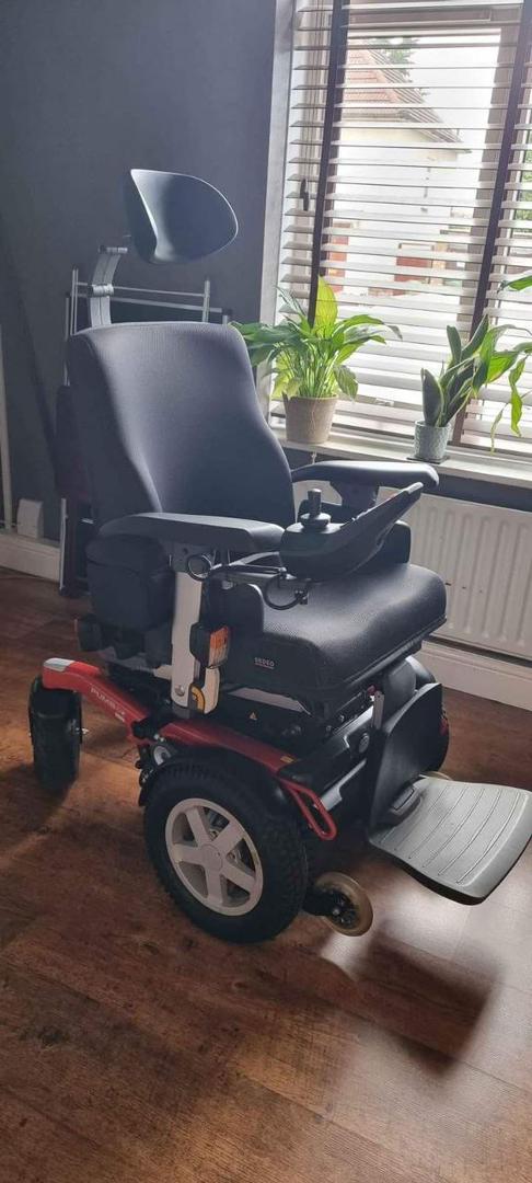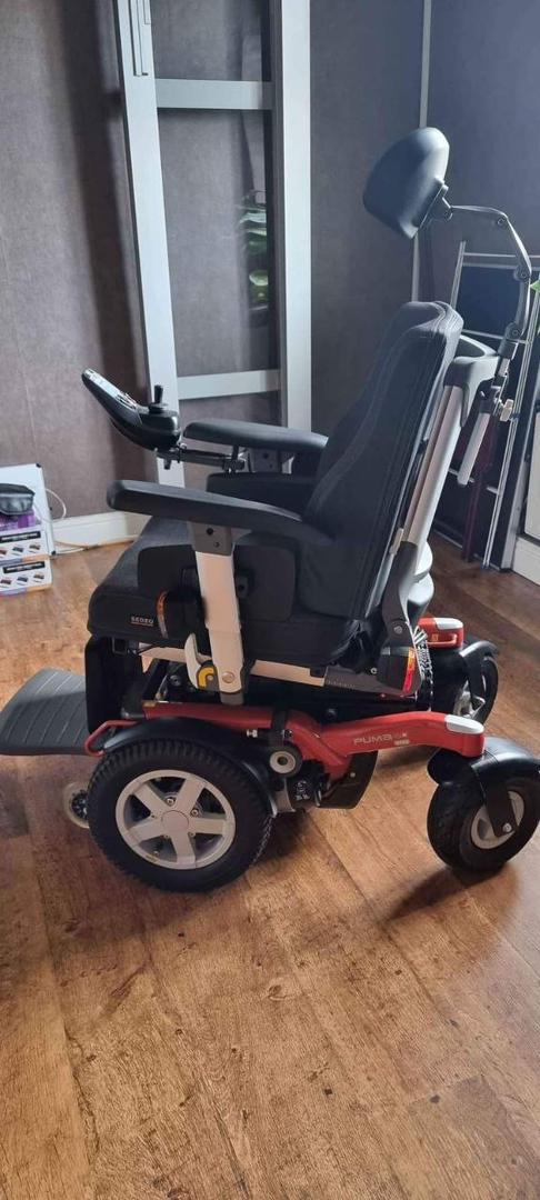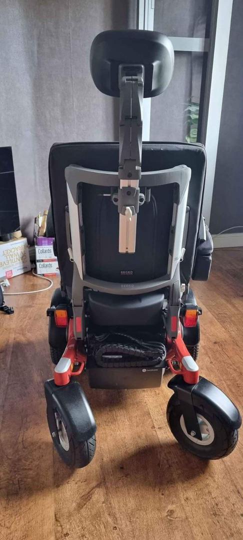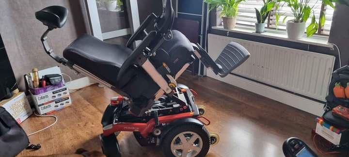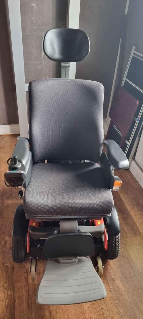 It was delivered, assembled, and never used. Has been stored ever since. Very clean – tires are in pristine condition as they have never touched pavement. Seating is standard, no elevation, adjustable depth, limited recline, high back captain seat 20″×18″ -20″. Retro-fitted push from behind handlebar was fabricated and installed so that it could be pushed and/or controlled from behind (this is removeable and the controller can be installed on right armrest as shown on the owner’s manual). Adjustable height, flip-up armrest. Collapsible cup holder. Lap belt. Rear basket. 8-1/2″×6″ swing-away foot plates/foot rests (these are removeable) available $1900 •